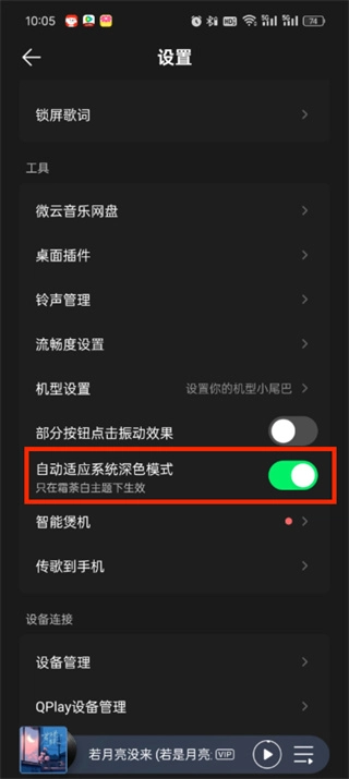 最后点击后进入设置页面,找到【自动适应系统黑色模式】选项,点击开启后方的按钮就可以了。