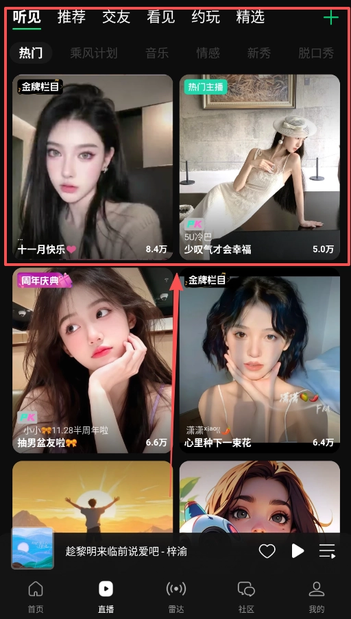 要是想参与互动,不妨进入“社区”页面,也可以在金牌栏目中收听情感音乐或脱口秀,碰到感兴趣的内容只需轻点一下就能加入讨论哦。