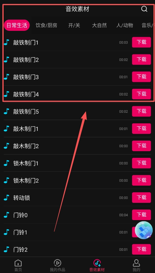 要是你想找特定的音效,直接进入“音效素材”板块就行,这里的素材已经按照“饮食/厨房”“开/关”这类场景分好类了。