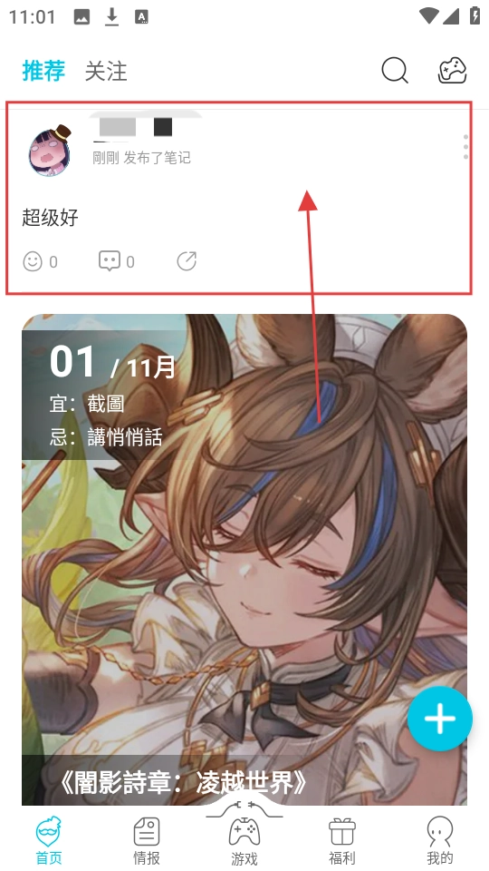 在首页点击蓝色的【+】按钮,就能进入笔记发布界面,分享你在游戏中的体验与感悟啦。