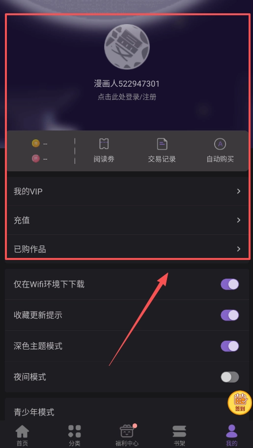 首先要搭建你的个人阅读根据地,也就是完成登录和初步配置,尤其要在“我的”页面里开启收藏更新提醒。