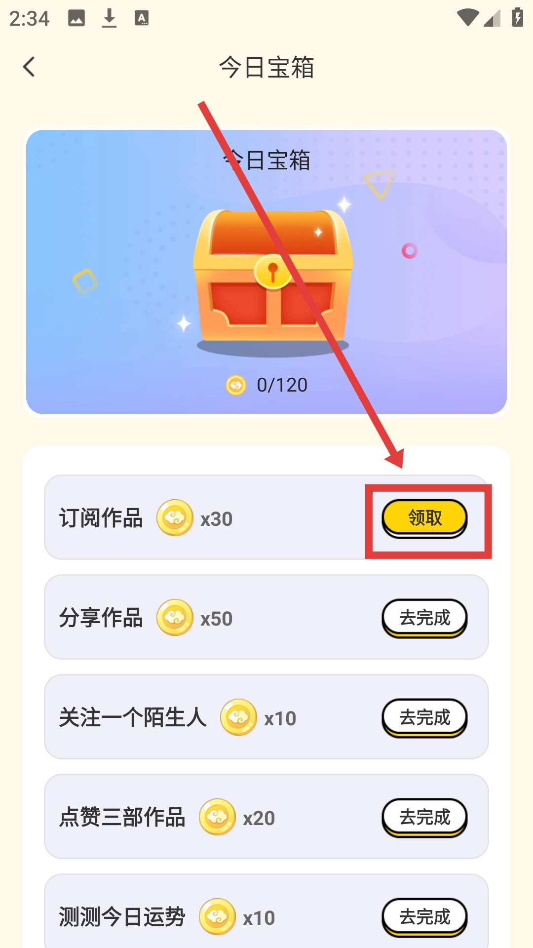 完成订阅作品的任务后,返回赚金币页面并点击“领取”按钮,就能获得30金币了。