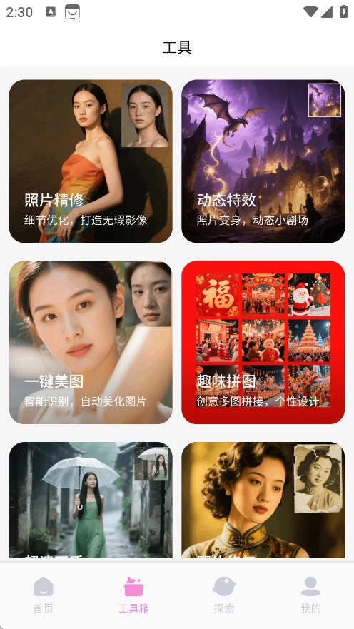 工具箱里包含了照片精修、动态特效、一键美图、趣味拼图、超清画质和照片修复等功能。