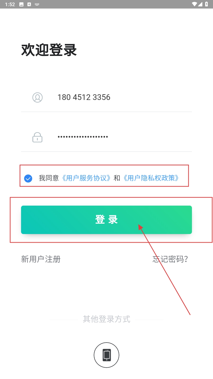 点击【请输入您的密码】框,录入密码,勾选协议。