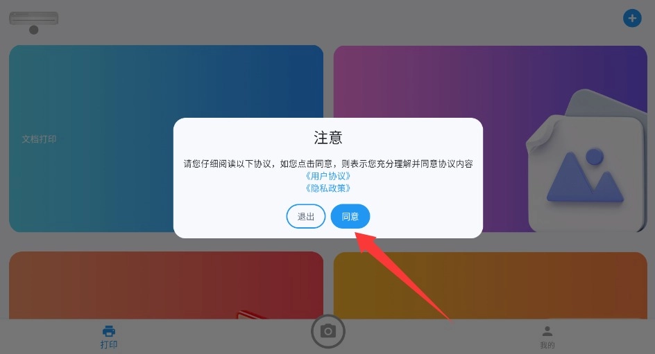 2、在首页左下角勾选同意条款后,点击页面中央的加号图标,即可开始创建新的打印任务。