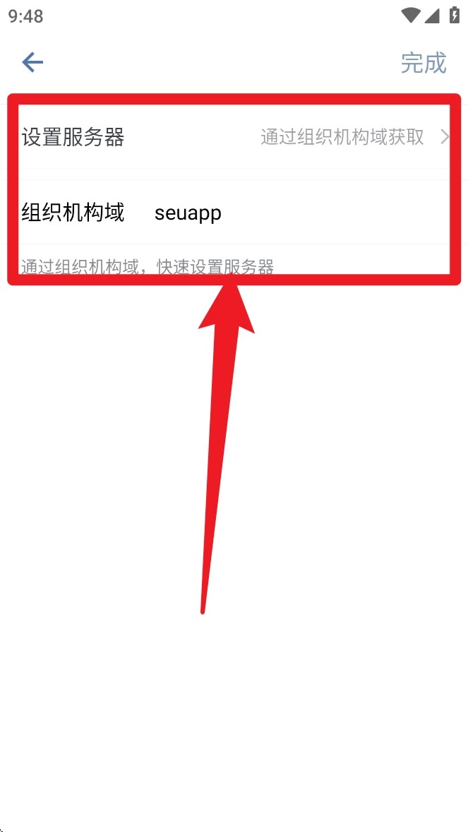 1. 打开App后进入设置界面,输入组织机构域名「seu」,以此完成服务器的初始化配置。