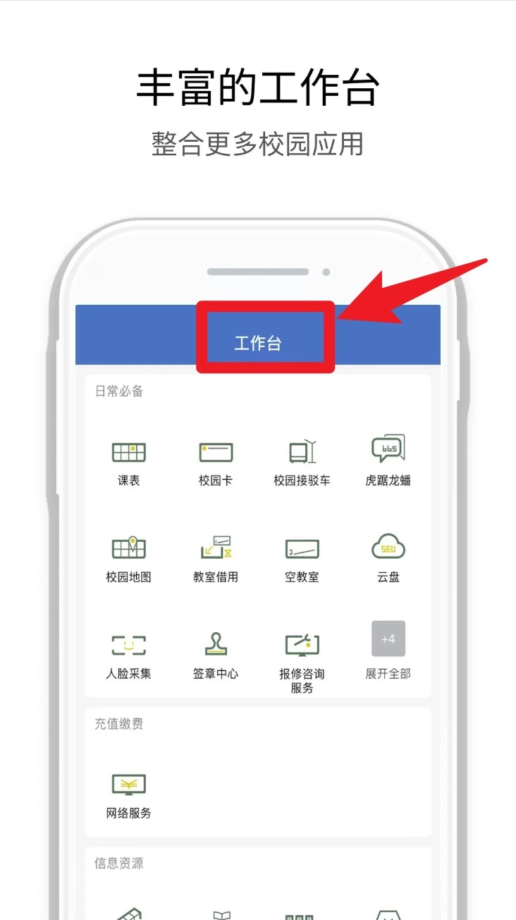 3. 登录成功后,点击页面上方的「工作台」入口,进入常用功能区域,在这里可以进行查课表、借教室、报修等操作。