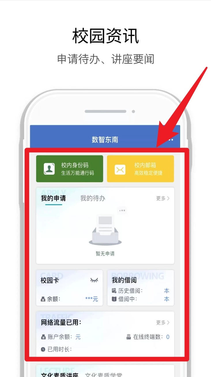 4. 切换至「校园资讯」页签,即可查看校内通知、办事申请、邮箱服务以及校园卡余额等相关信息。