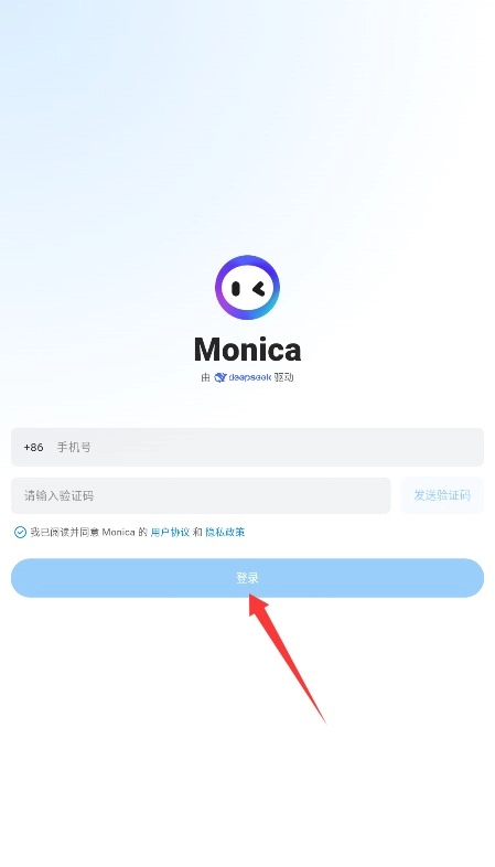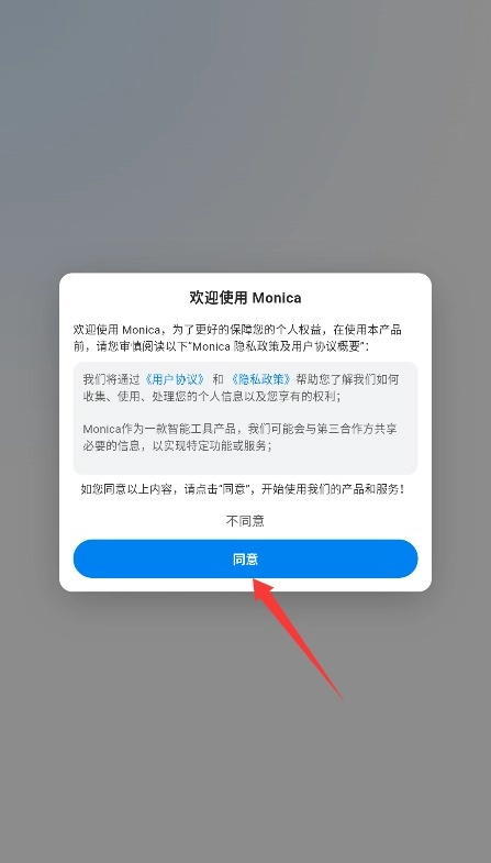 1、启动monicaai应用,认真阅读用户协议和隐私政策后,点击同意按钮进入登录界面。