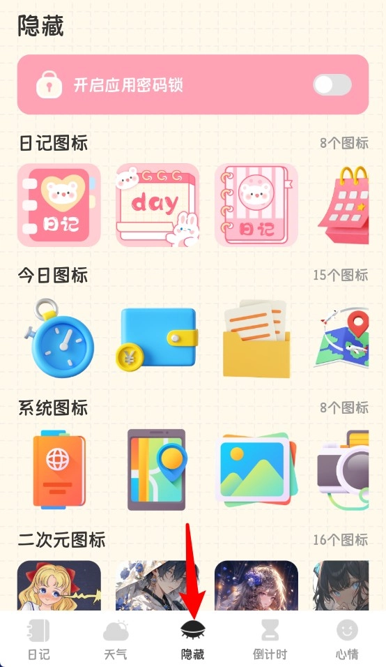 2、“隐藏”功能设有图标自定义和应用锁选项,既能保障日记隐私,又能美化界面风格。