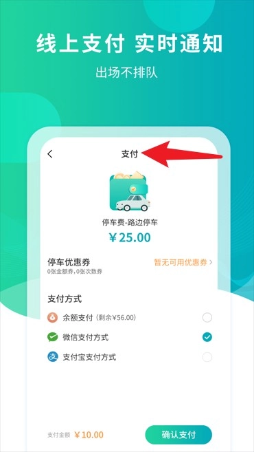 3、停车结束后进入支付页面选择支付方式,通过在线完成缴费可省去排队的麻烦。