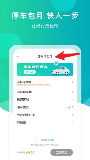 4、您可以选择使用“停车包月”功能,只需设置好车牌信息与对应的停车区域,就能根据自身需求更便捷地办理月卡。