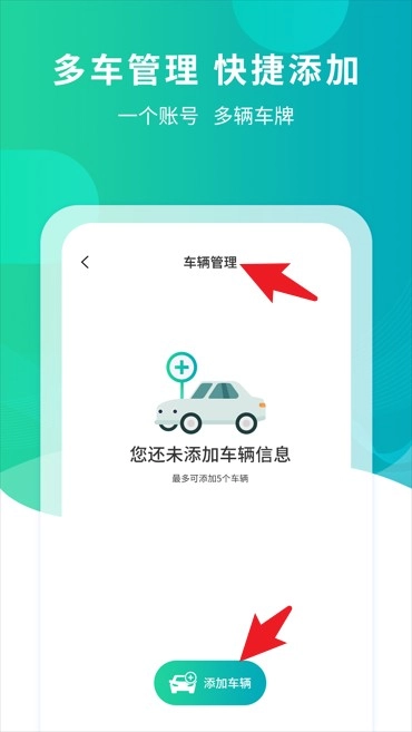 5、点击“车辆管理”选项,即可添加或管理多个车牌信息,该账号支持多车共用。