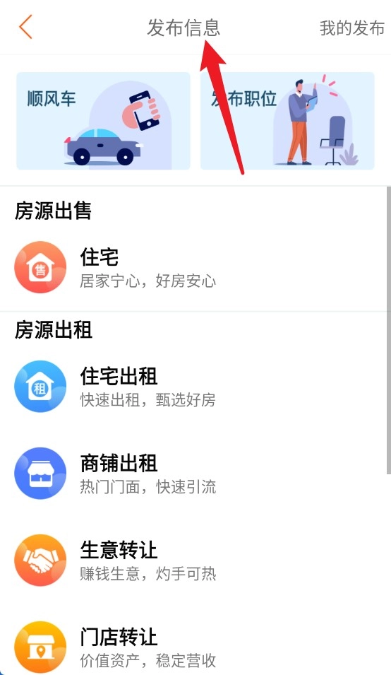 3、点击底部的“发布”按钮,就能发布房源、招聘、二手物品等各类本地信息。