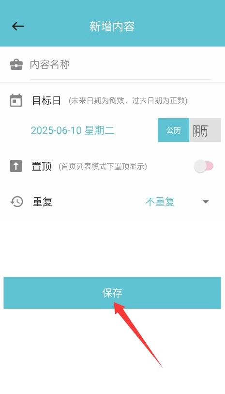 3、输入事件名称、设定目标时间及重复周期,保存后可在首页查看所有倒计时事项。