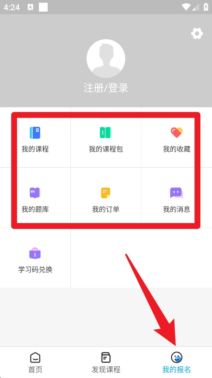 5. 点击“我的报名”进入个人中心,可查看已购课程、题库、收藏及订单记录等。