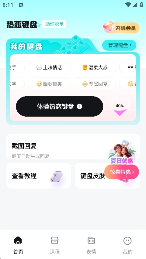 热恋键盘这款软件能帮你轻松掌握各类话术,这里有最精彩的免费话术资源,你可以获取丰富多样的信息,而且内容汇集得十分全面,让你轻松学到最全的回复技巧,助你成为高情商的人,让身边的朋友都喜欢你。
