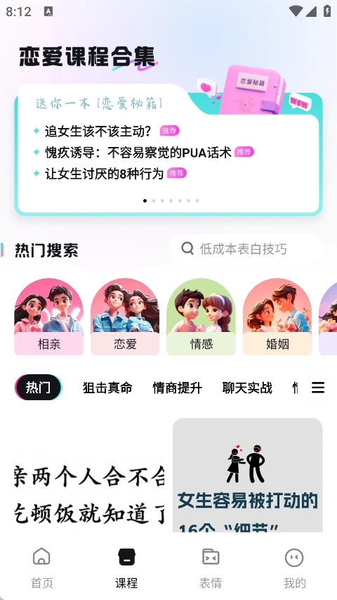 在课程页面中,不仅能看到热门搜索的各类表白技巧,还设有不同分类的课程板块。