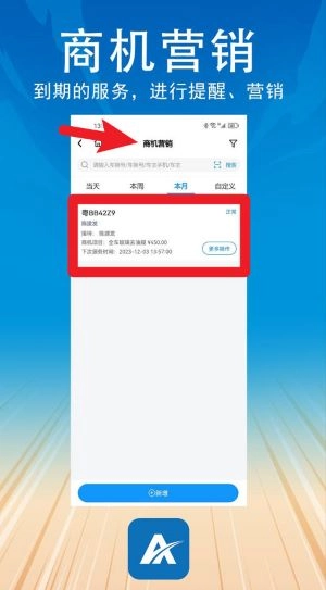3、在“商机营销”页面中可按时间筛选即将到期服务,对车主进行提醒与营销推荐。