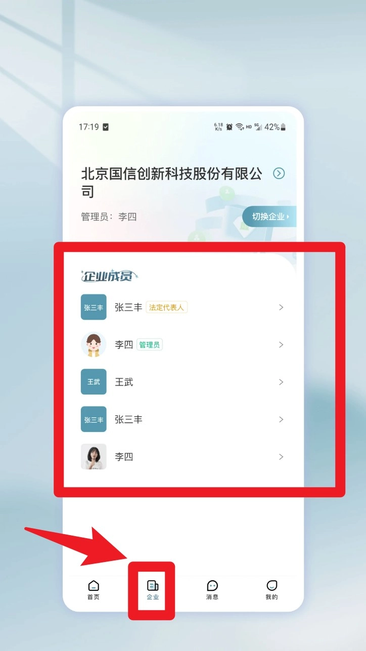 进入首页后,点击底部的“企业”模块,就能查看公司成员列表以及当前所属的企业信息。