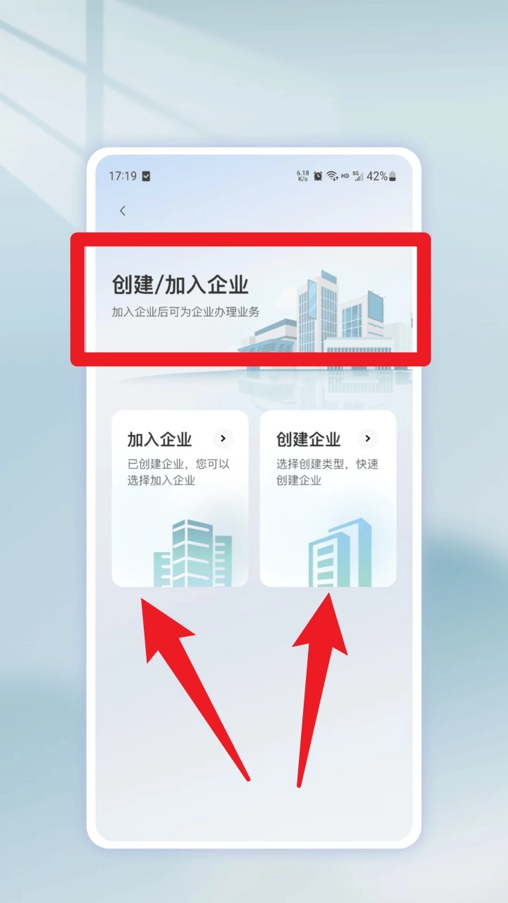3. 进入“企业”页面后,点击“创建/加入企业”的入口,接着根据需求选择创建新公司或者申请加入已有的企业。