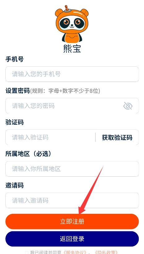 1、打开熊宝应用后,认真阅读用户协议和隐私政策,点击同意并接受按钮,即可进入注册界面。