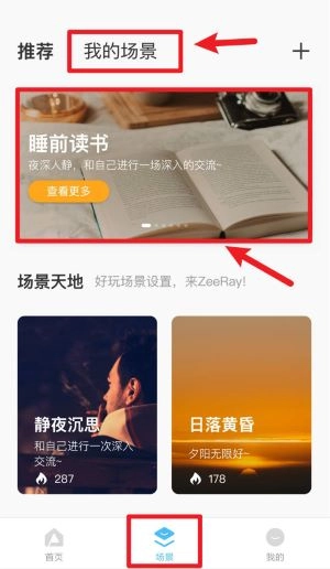 4、点击底部的“场景”按钮进入推荐页面后,既能浏览热门场景并通过点击“查看更多”知晓详情,也可以切换到“我的场景”板块,对自定义的灯光模式进行管理。