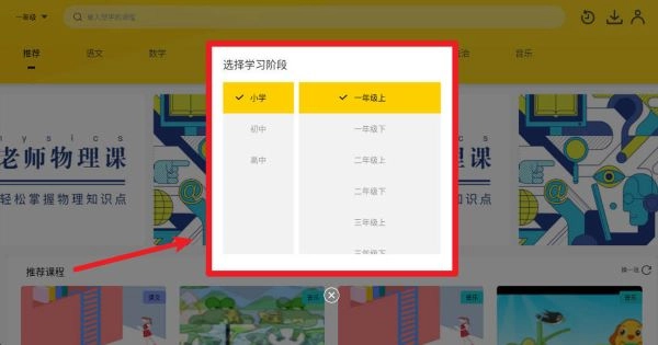 首次进入系统时,会弹出选择所属学习阶段和年级的窗口,比如小学一年级上册,系统会自动匹配对应的课程内容,帮助用户精准找到学习资源。