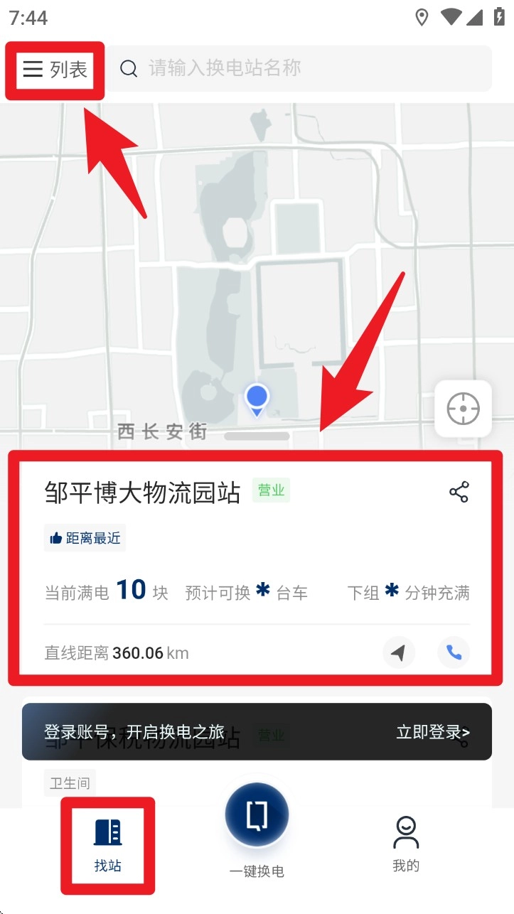 1. 打开骐骥换电App,点击底部导航栏中的“找站”选项,就能借助地图或列表两种方式查看周边的换电站点。