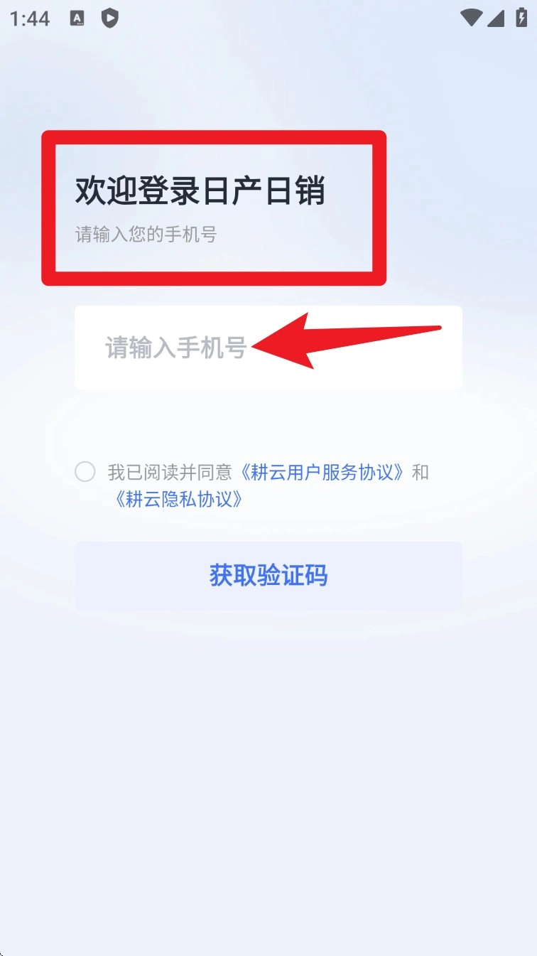 1. 打开 App 后输入手机号码并勾选协议,即可点击“获取验证码”完成注册与登录操作。