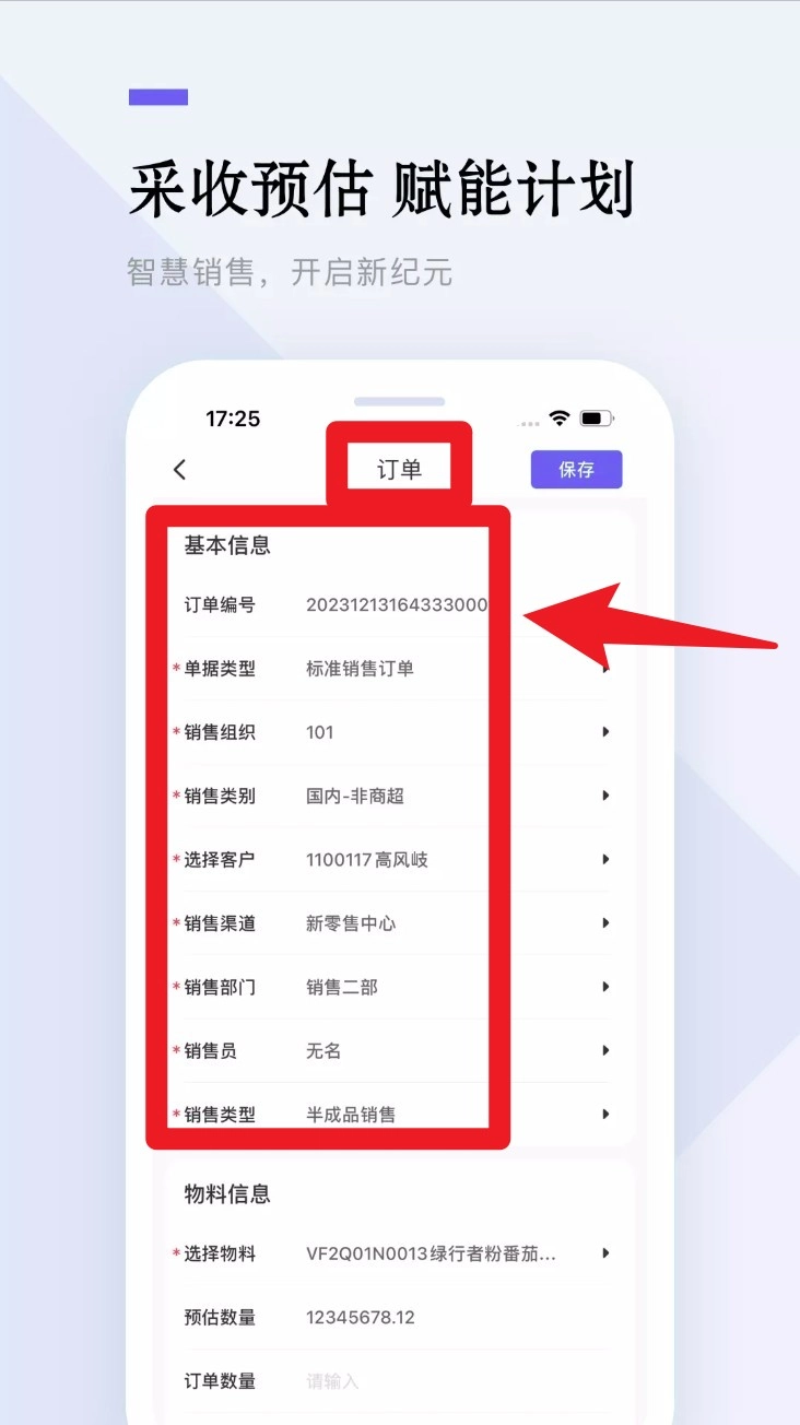 3. 添加订单:点击添加图标进入订单编辑页面完善订单信息并保存订单内容。