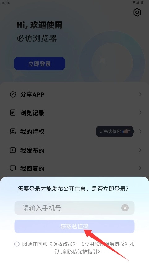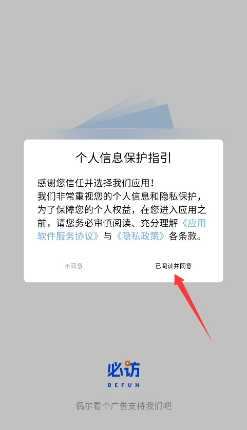 1、首次启动必访小说应用时,系统会弹出用户协议和隐私条款的提示页面,需点击“已阅读并同意”按钮后,方可进入应用主界面。