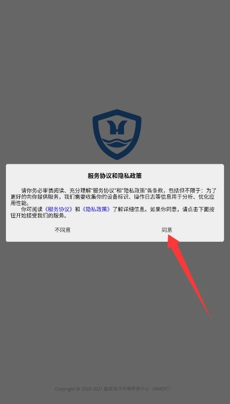 首次使用中国海洋预报应用时,系统会弹出用户协议和隐私条款的提示,建议您仔细阅读相关内容,确认无误后点击“同意”按钮,即可进入应用的主界面。