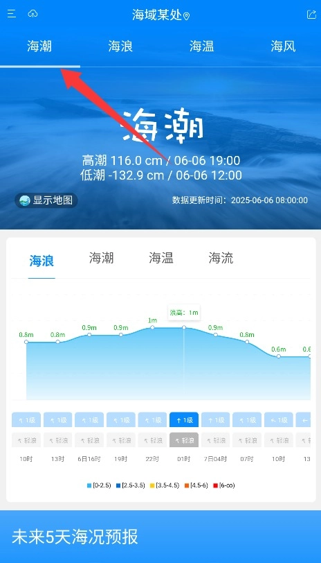 3、在首页顶部的导航栏中找到并点击“海潮”功能选项,就能查看实时的潮汐数据以及未来潮位变化的预测信息。
