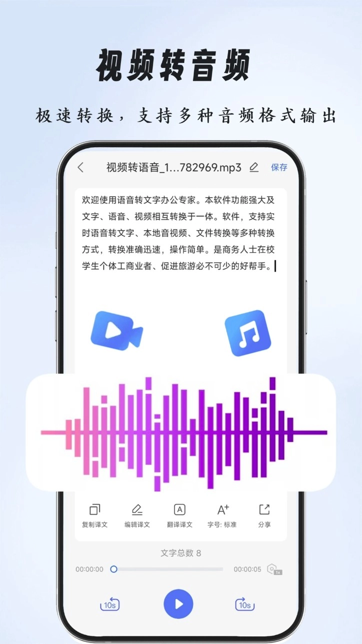 语音文字办公专家是一款便捷高效的录音工具,拥有强大的录音转文字能力,录音结束后能直接一键复制内容使用。它支持多场景下的语音转写与翻译,适用于会议、采访、学习等多种需求,可大幅减少文字整理的工作量,并且还能快速导入已有的文本进行编辑。