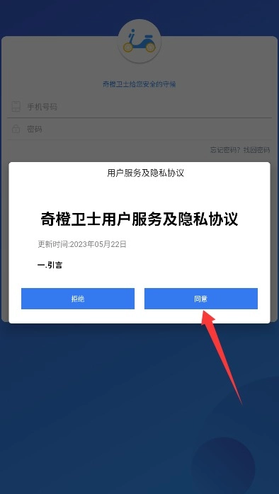 1、第一次打开奇橙卫士时,要认真阅读用户协议和隐私条款,在确认内容没有问题后,点击同意按钮就能进入注册页面了。