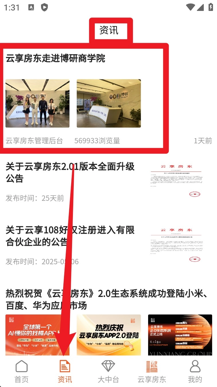 3. 点击进入“资讯”页签,可浏览平台动态、版本公告以及楼盘进展等内容,便于及时掌握行业最新资讯和平台的相关变动信息。