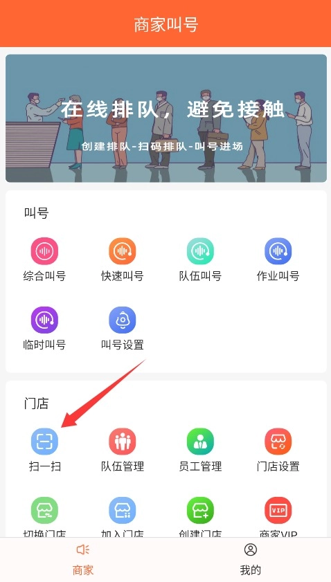 3、进入应用主界面后,找到并点击门店扫一扫功能,将扫描框对准商家提供的排队二维码,就能完成扫码取号操作。