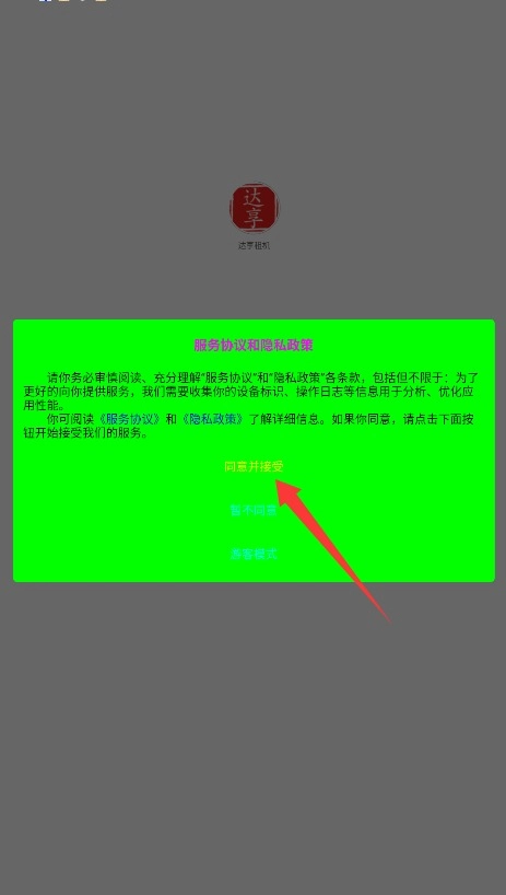 首次使用达享租机服务时,需仔细阅读用户协议与隐私政策的全部内容,点击同意并接受相关条款后,即可进入登录页面。