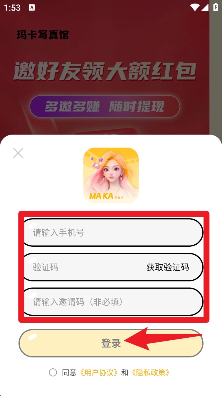 1. 进入玛卡写真馆后,在登录页面输入手机号,点击获取验证码并填入,操作完成后点击下方的“登录”按钮。