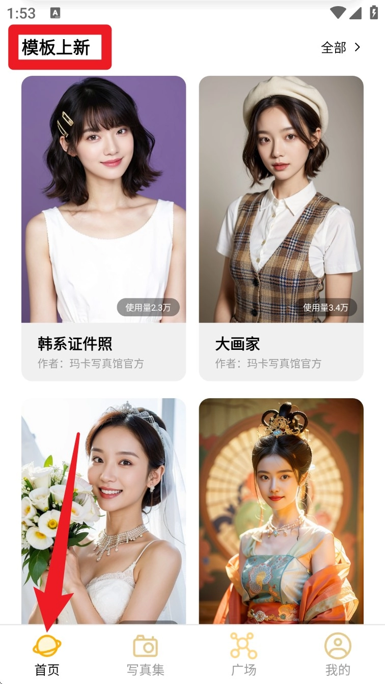 2. 登录成功后,进入首页就能浏览热门模板,点击顶部的「模板上新」专区可查看最新上传的风格模板。