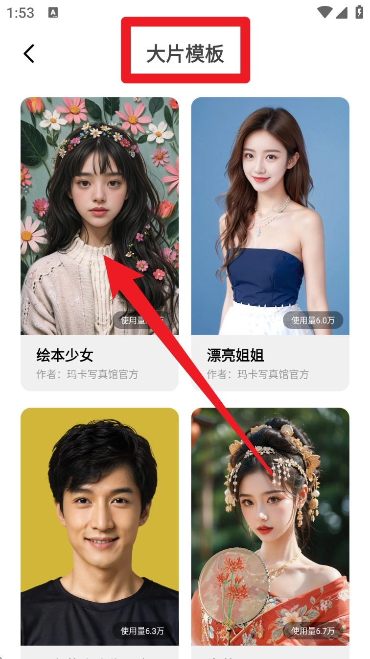 3. 进入「大片模板」板块后,你可以浏览各种各样的造型风格,从中挑选出你心仪的主题,像“绘本少女”这类主题就很受欢迎,选定后点击对应的封面图就能进入该主题的详情页面了。