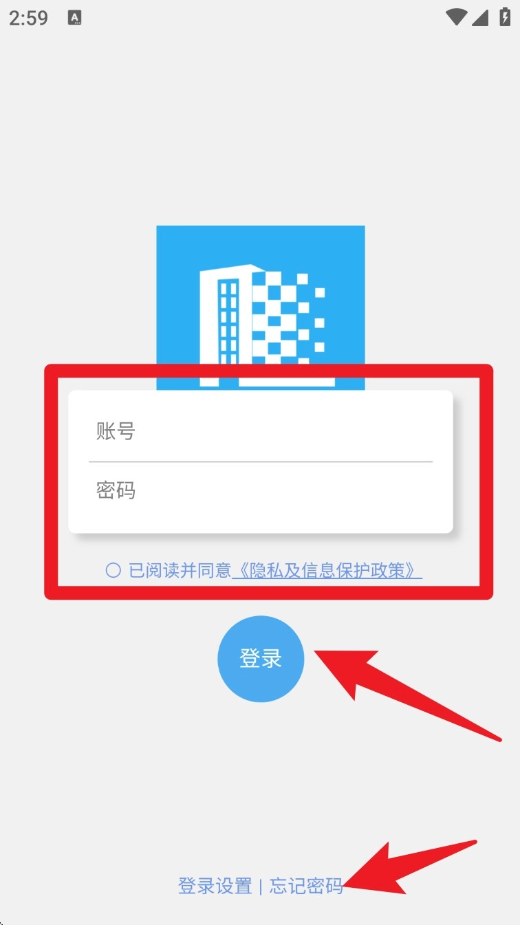 1. 启动精致物业管理系统App,输入账号与密码进行登录操作,若不慎忘记密码,可点击页面底部的“忘记密码”选项来重置密码。