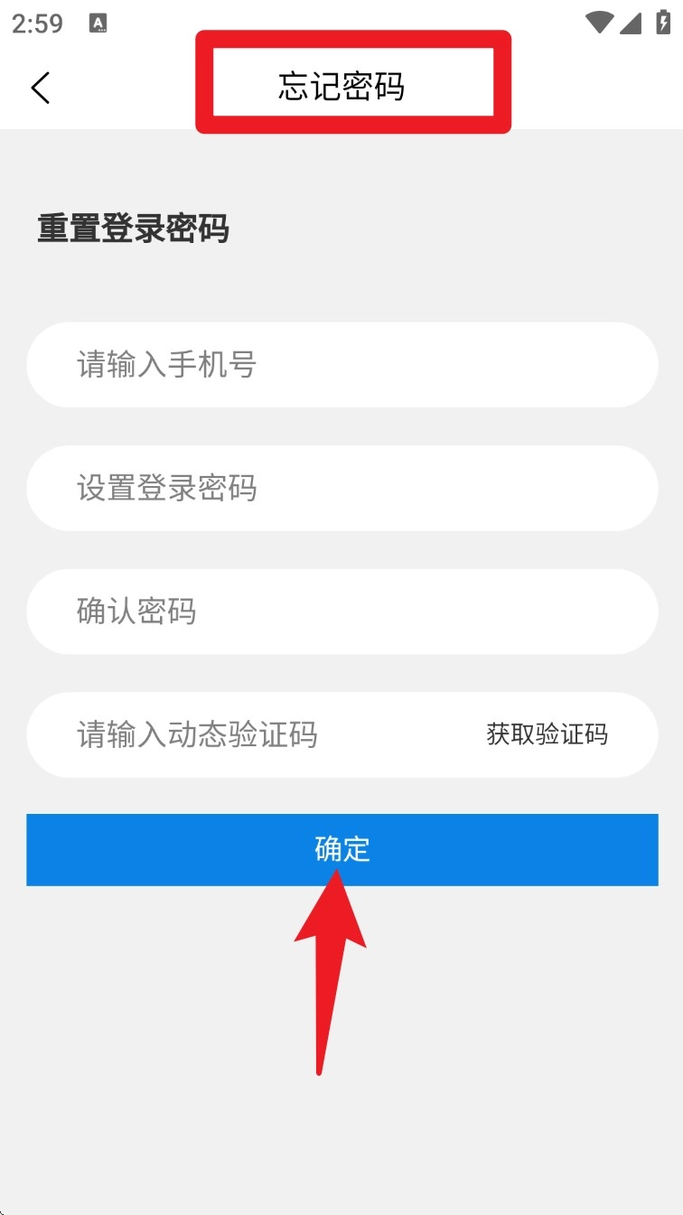 2. 进入“忘记密码”页面,依次填写手机号、新密码,输入验证码后点击“确定”按钮,即可完成密码重置操作。