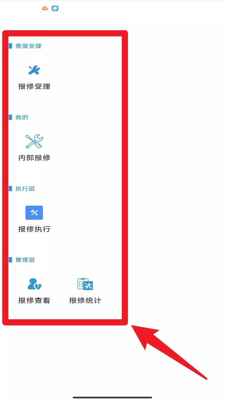 3. 登录成功进入首页后,在“报修模块”里,不同角色可分别进入报修受理、执行、查询或统计界面。