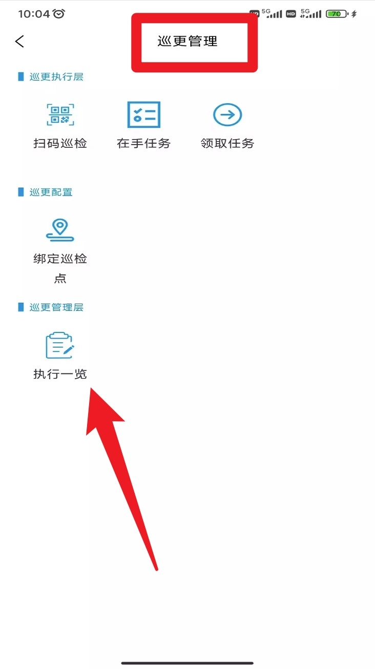 4. 点击“巡更管理”选项,能够查看当前正在进行的巡检任务,执行人员可以通过扫码完成打卡操作,同时还能查看任务的详细信息以及执行的进度情况。