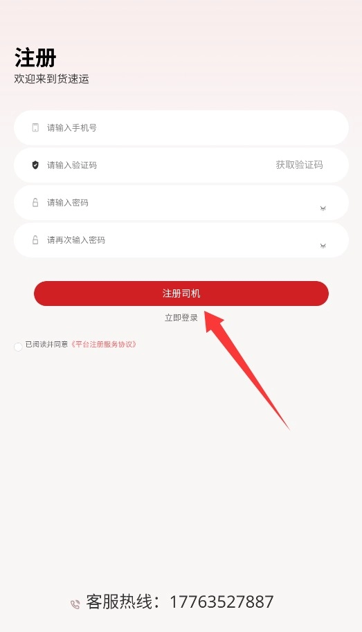 2、在注册页面填写有效的手机号码并获取验证码,设置满足要求的登录密码后,点击提交按钮即可完成司机账号的注册流程。
