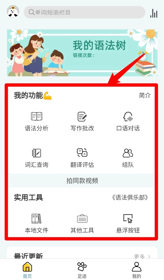首页设有语法分析、写作批改、口语对话等实用功能,同时配备词汇查询与翻译评估工具以辅助学习。