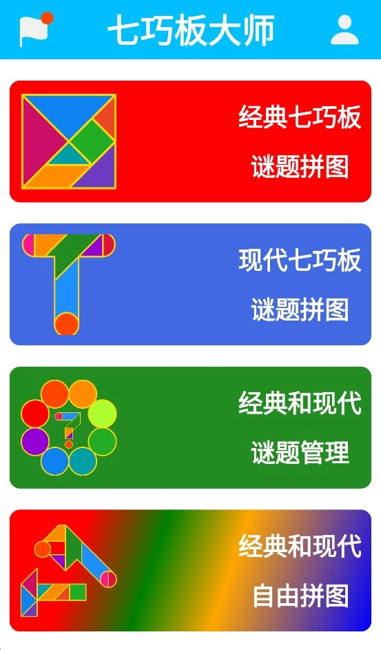 包括经典七巧板、现代七巧板、经典和现代谜题管理及经典和现代自由拼图;经典七巧板有人物拼图、动物拼图、符号拼图、物体拼图、几何拼图;自由拼图包括更多样式的拼图,扣篮、机器人、火箭、小博士、天鹅等。