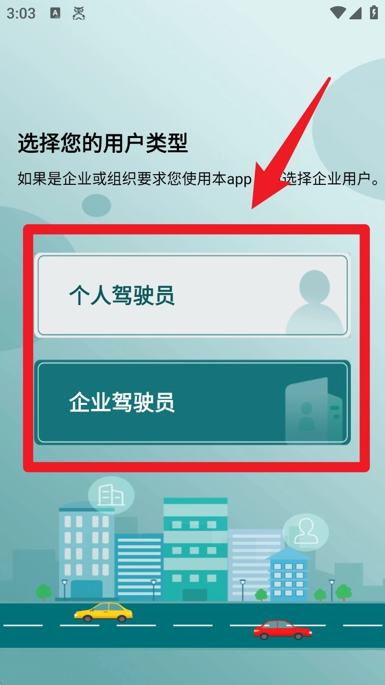 进入应用后,第一步是选择用户类型。若您是个人司机,请选择“个人驾驶员”;若是企业内部用车场景,则选择“企业驾驶员”。